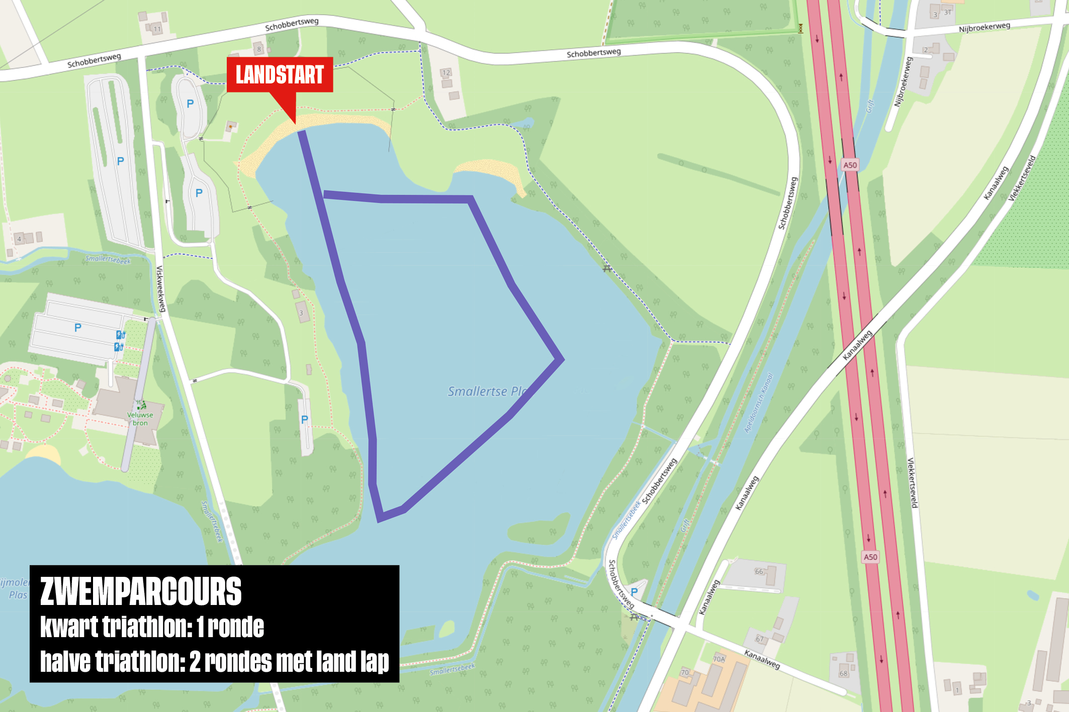 Het zwemparcours bestaat voor de kwart triathlon uit 1 ronde en voor de halve triathlon 2 ronden. Het betreft een strandstart, waarbij voor de halve triathlon een landlap geldt. Na de eerste ronde is het dus de bedoeling dat je over het strand jouw tweede ronde vervolgt.